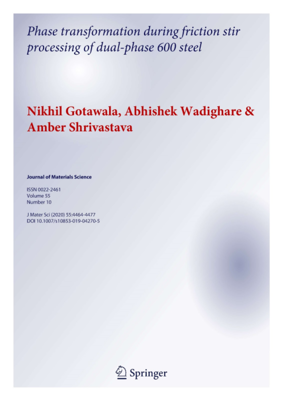 Our paper titled 'Phase transformation during friction stir processing of dual-phase 600 steel' is accepted for publication in the Journal of Materials Science. Congratulations Nikhil and Abhishek!!