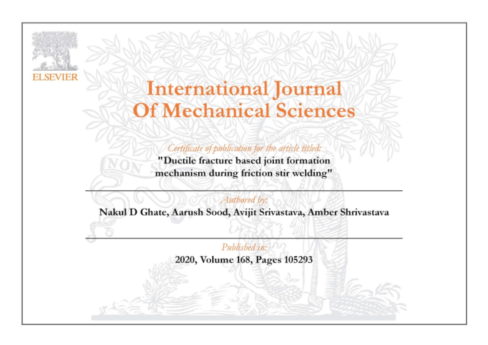 Our Paper titled 'Ductile fracture based joint formation mechanism during friction stir welding' is accepted for publicaiton in the International Journal of Mechanical Sciences. Congratulations to Nakul, Aarush and Avijit!!